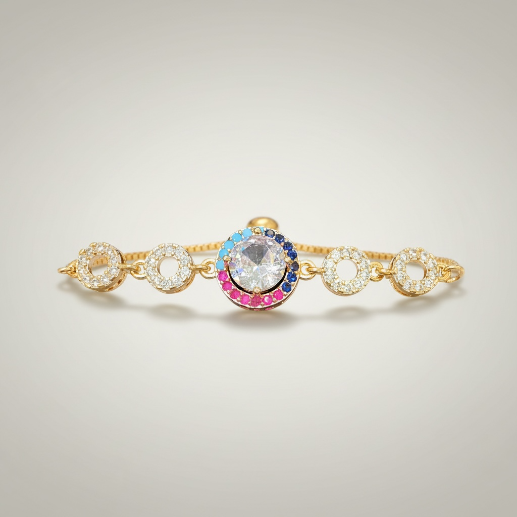 Crafted with a premium gold finish and delicate circular crystal links, this bracelet blends tradition with modern elegance. Its adjustable chain ensures a perfect fit, making it ideal for everyday wear or special occasions.