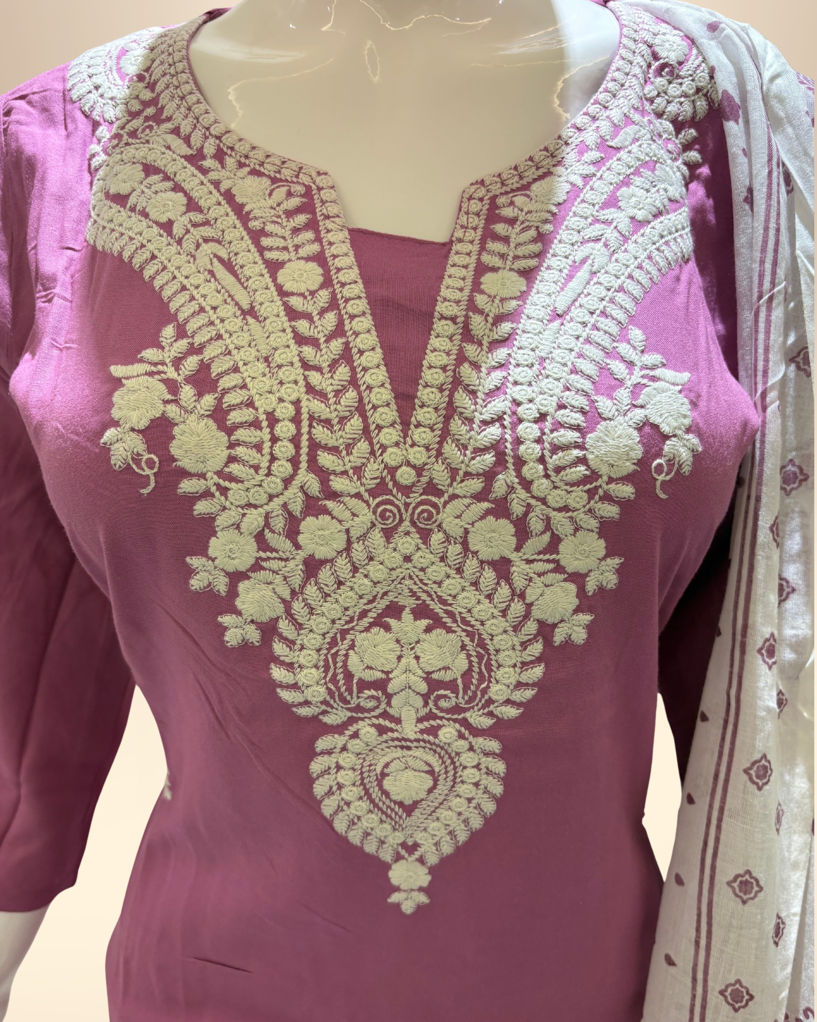 Upgrade your ethnic wardrobe with this elegant purple embroidered kurti set, designed to offer a perfect balance of tradition and comfort. The kurti features intricate embroidery on the neckline, adding a touch of sophistication and charm.Paired with matching pants and a beautifully printed dupatta, this set is ideal for both everyday wear and festive occasions. Crafted from soft and breathable cotton fabric, it ensures all-day comfort while keeping your style effortlessly graceful.
